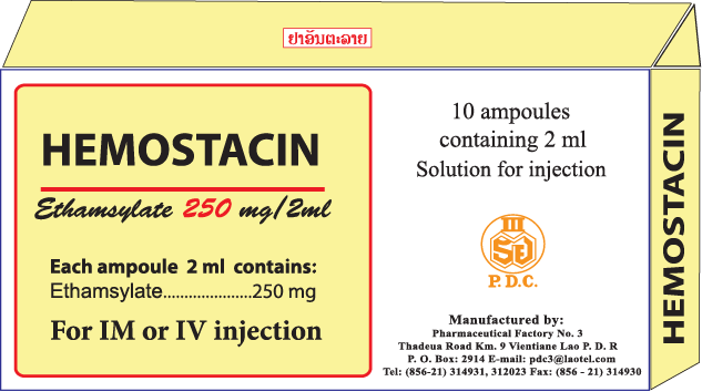 ວິນຫົວ ໂດຍບໍ່ຮູ້ສາເຫດ - Symptomatic treatment of vertigo ສ່ວນປະກອບ/ Composition Each 100ml contains Ethamsylate 250mg ຂະໜາດ Size: 2ml ການບັນຈຸ / Packaging: 10 amp x 250 box / carton ຄຸນປະໂຫຍດ/ Indication - ເປັນຢາຫ້າມເລືອດ,